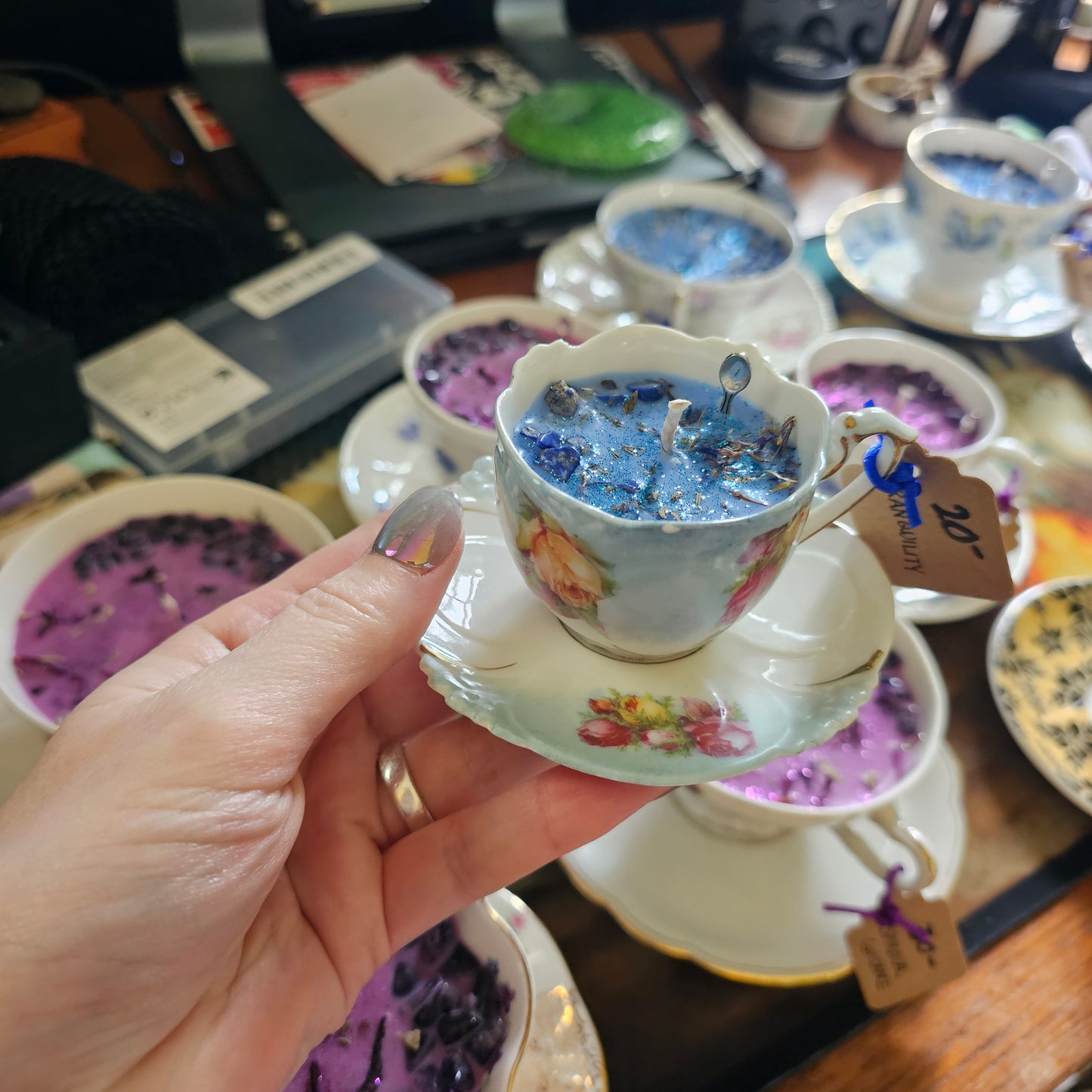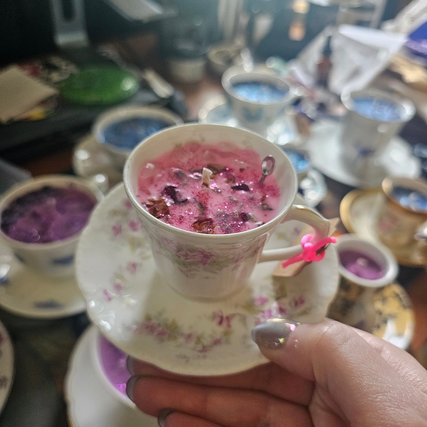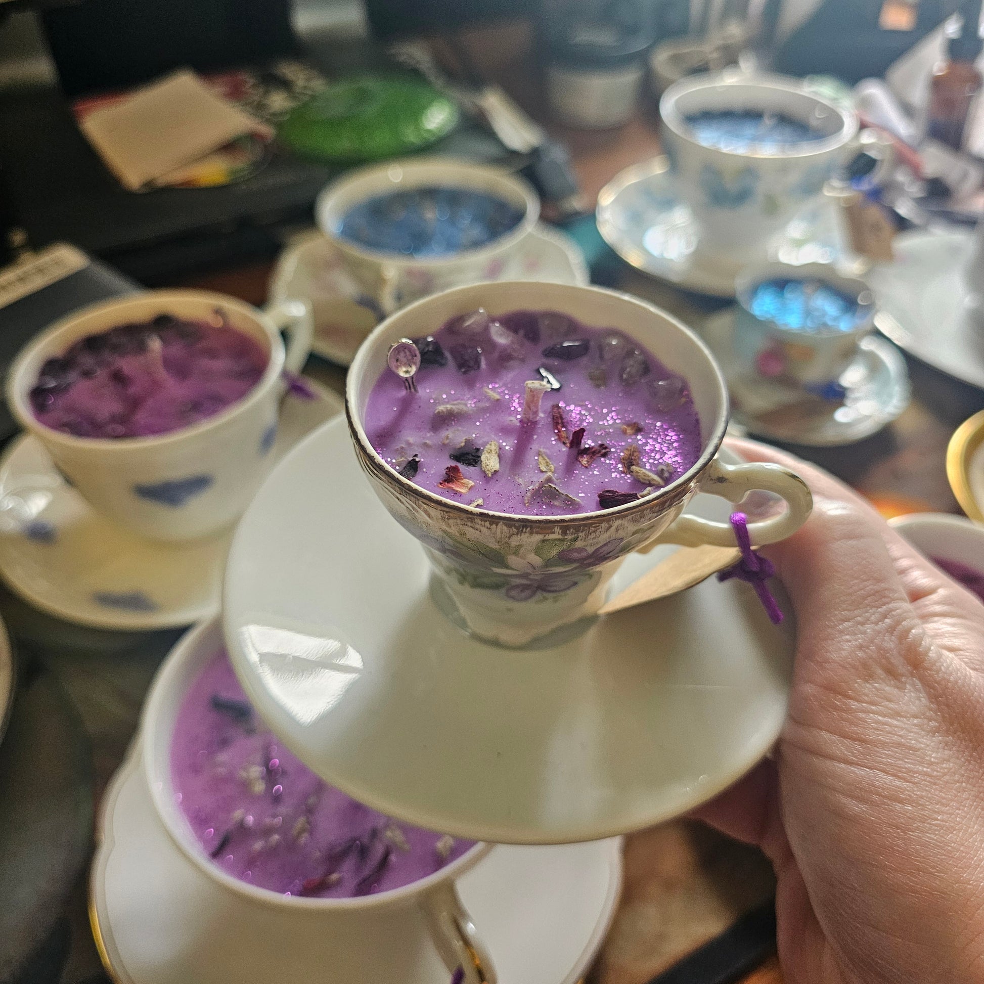 These authentic antique bone china teacups have been repurposed into beautiful metaphysical candles of intent. The cup and saucer have become one piece, creating a stable base that can be used as an altar plate. Place objects of intent on your saucer, whether it’s crystals, talismans, a photo, etc. They are made with 100% soy wax, adorned with crystals and herbs, and sprinkled with biodegradable plant-based glitter.